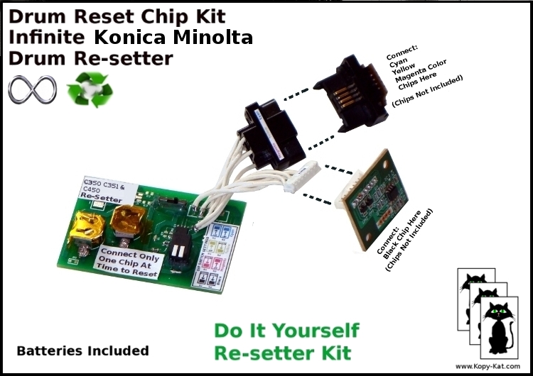 Kopy-Kat! introduces our E-Z C350 image drum reset kit works for C350 C351 C450 Imaging IU-310 Konica Minolta Bizhub for North American printers. With our 4 step kit below you will be able to reset your own drum counters for pennies on the dollar. Just slide the drum chip into the re-setter coupling connection. Choose the appropriate color reset (cyan, yellow, magenta, or black) on the piano style dip switch (see settings below). Slide the switch and wait until the green LED light is turned on. You now have reset your counter to new condition, its that easy. Please check out all our product listings at https://www.kopy-kat.com How to Use Your Drum Reset Chip ToolStep 1.