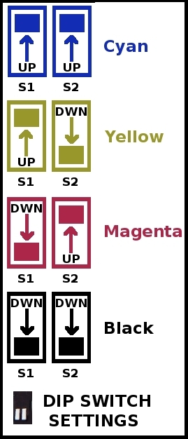 Slide on your used Minolta Color Drum Chip (Cyan, Magenta, Yellow) or the Minolta Black Chip but do not do both simultaneously. ![]() Step 2. Toggle the correct DIP Switch Setting for the type of Chip to reset (see table below): ![]() Step 3. Flip on the reset switch. ![]() Step 4. Wait for green light to come on. Release the reset switch, and you've now reset your Drum Chip for that color. Repeat Steps 1 through 3 for other 3 color chips. Its not necessary to match color of cyan, yellow, or magenta chips to previous usage as they can all be converted to one another by the dip switch, only black chip is physically different. When your done with resetting all your chips, store your "Infinite Minolta Drum Re-setter" for next time. Finally, install your recharged chips. ![]() The infinite re-setter kit utilizes (3) 11.6mm AG10 equivalent watch batteries (batteries included) which will last for years without replacement, but these batteries can be bought 8 in a pack from your dollar store for just a dollar. So maintenance of this kit is indefinite and cheap.